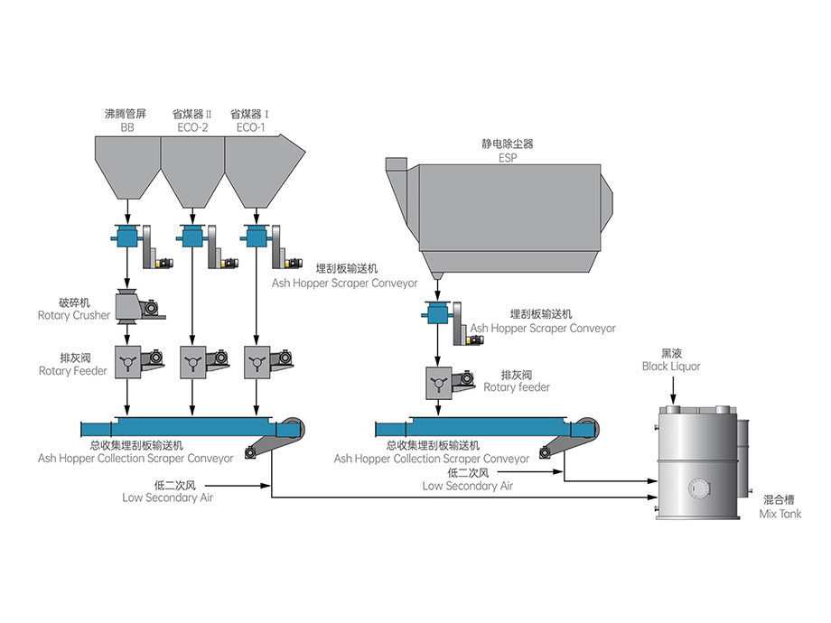 碱灰系统 的主要功能是回收黑液燃烧过程中产生的碱灰,碱灰通过刮板机收集和输送系统送入混合槽与蒸发来的黑液混合后再送回蒸发结晶增浓 。