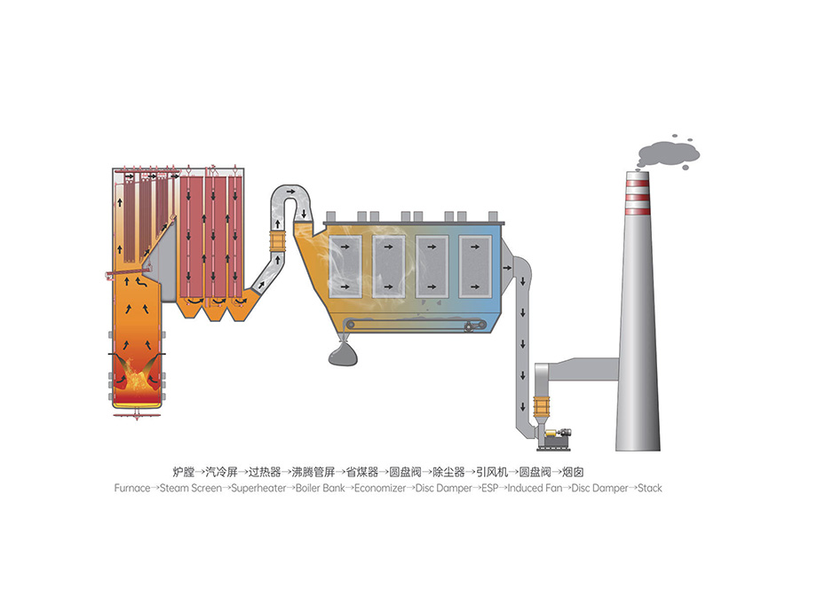 炉膛→汽冷屏→过热器→沸腾管屏→省煤器→圆盘阀→除尘器→引风机→圆盘阀→烟囱