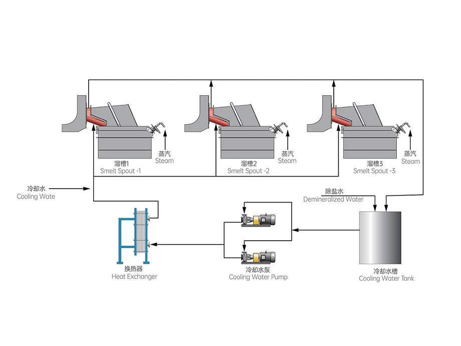 利用虹吸原理在不借助外力的条件下,水柱的压力差使使水上升后再流到低处。溜槽采用分散布置,在结构上选用水冷夹套式,冷却溜槽,延长寿命;全程采用自动化联锁预警,且配套应急供水系统。