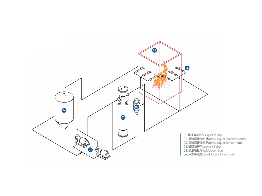 稀黑液经蒸发浓缩后存到入炉黑液槽带压保温缓存,由黑液泵泵送经过间接加热器或直接加热器进一步加热提高入炉热量,再由黑液喷枪分散均匀喷入炉膛燃烧。
