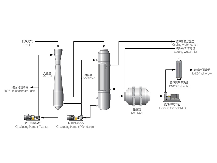DNCG收集后进入文丘里进行洗涤除尘,然后在进入冷凝器降温至50℃,再除雾、升温至100℃以上进入碱炉/焚烧炉燃烧。