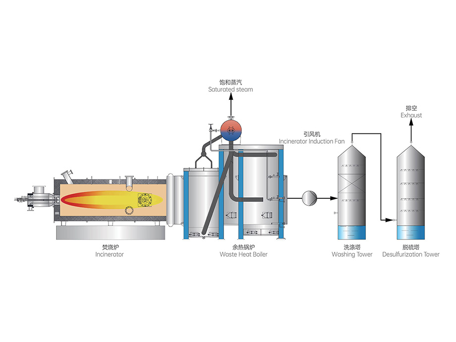 高、低浓臭气经过臭气焚烧炉内高温(850℃)燃烧分解;然后进入余热锅炉,加热除盐水产生蒸汽;降温后的烟气再经过烟气洗涤塔、脱硫塔,洗涤除尘降温、脱硫后达标排放。