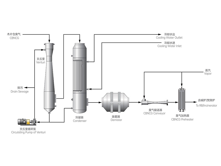 木片仓气体含有少量木屑,该部分的臭气先经过文丘里除 尘,经过冷凝器冷却降温后,再经过除雾器除雾后,经过蒸 汽喷射器输送,加热器加热升温至100℃以上进入碱炉/焚烧 炉燃烧。
