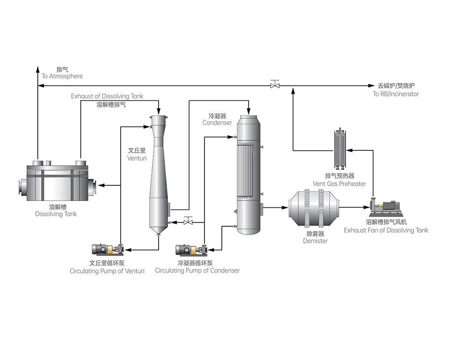 对于溶解槽及混合槽及放空尾气在碱炉车间布置一套处理设施,混合槽排气经过放空槽后与溶解槽排气一起收集后进入文丘里进行洗涤,再进入洗涤器进一步除尘,然后在进入尾气冷凝器降温至50℃,再除雾、升温至100℃