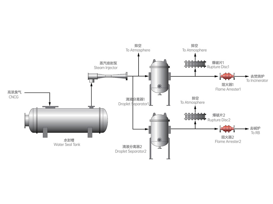 CNCG进入水封槽,经蒸汽喷射泵抽吸,经液滴分离器、阻火器,进焚烧炉燃烧;另一路经液滴分离器、阻火器,zui后进碱炉燃烧。